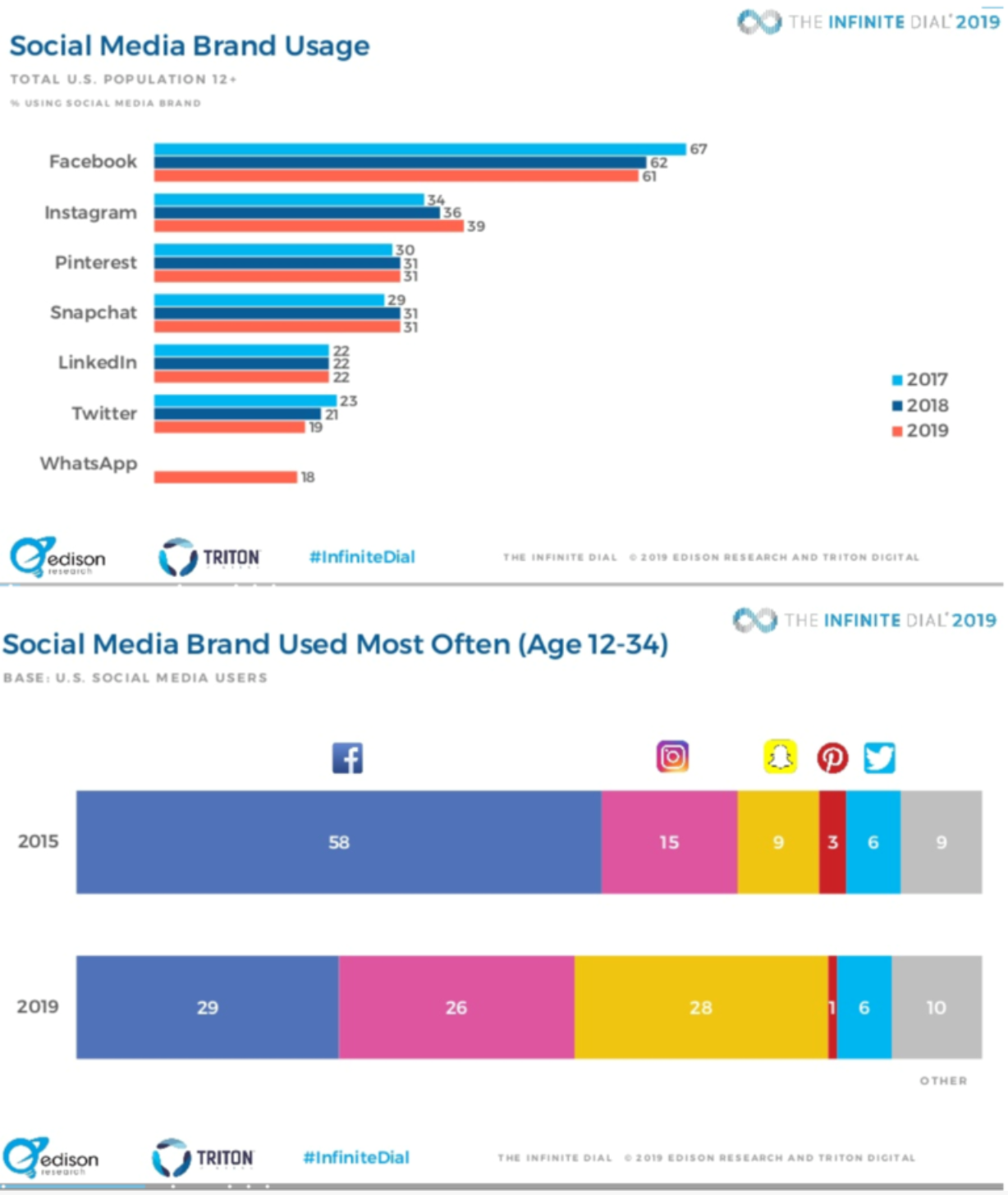 인피니티 다이얼 2019 리서치 리포트에 따르면 미국의 페이스북 사용자는 3년째 계속 감소하고 있는 반면에 인스타그램 사용자들은 3년 연속 증가를 기록하고 있다고 한다.