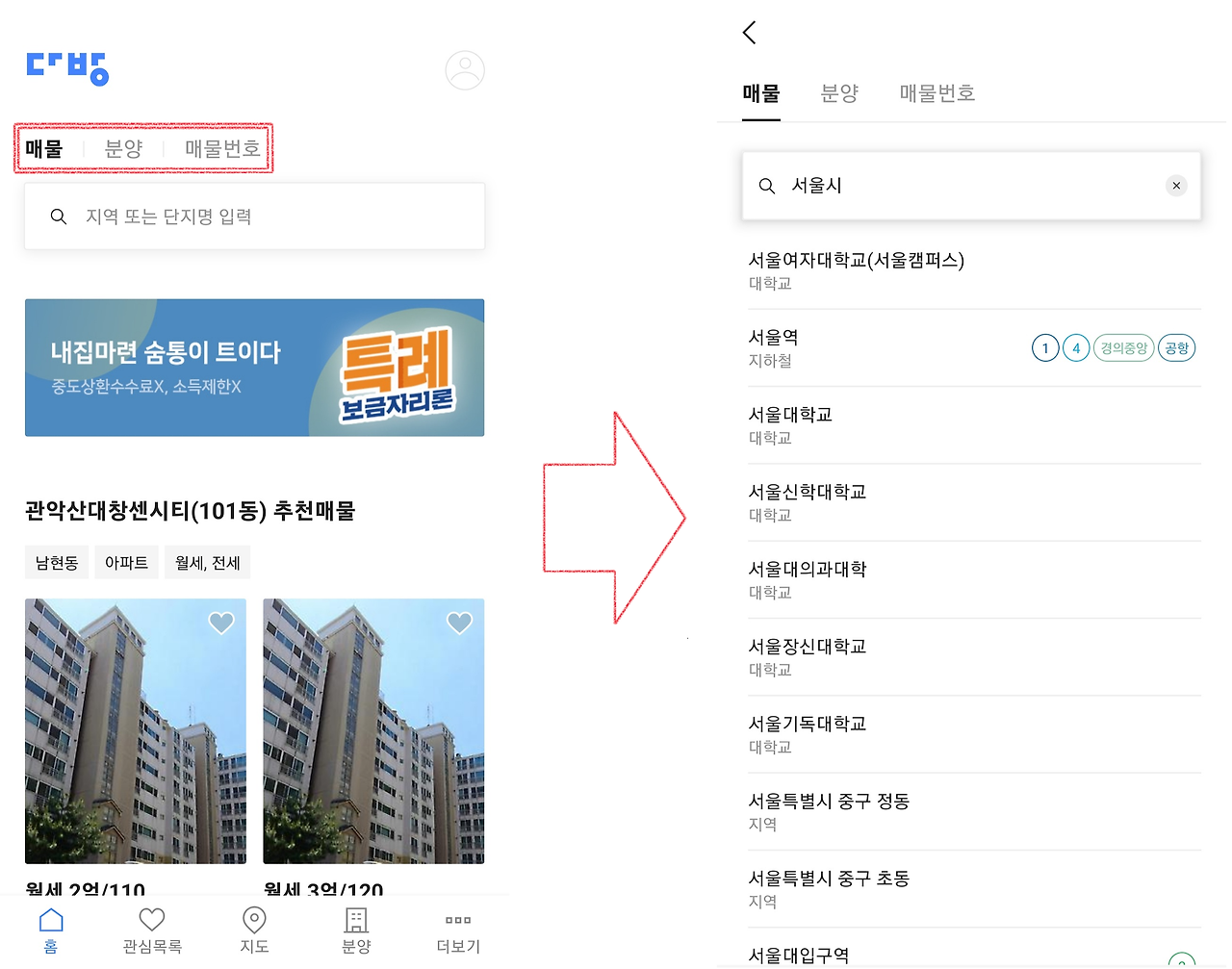 원룸/아파트/투룸/오피스텔/공공주택으로 각각 검색할 수 있으며 매물의 종류에 따른 거래유형,가격/관리비/방 크기 등의 조건을 통해 원하는 매물만 검색이 가능하다.