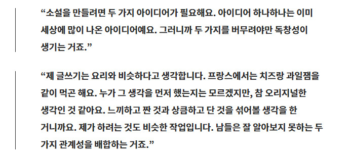 그래서 저는 좀 더 독창적이고 새로운 글을 쓰기 위해 ‘MIX, 섞기’를 활용합니다. 두 가지의 아이디어를 섞는 것이죠. 기왕이면 전혀 상관없는 두 분야의 소재를 섞을 때 더 새롭고 재미난 글이 탄생합니다. 늘 새로운 이야기로 우리를 즐겁게 해주는 작가, 베르나르 베르베르 또한 독창성은 두 가지 아이디어를 결합할 때 나온다고 말합니다.