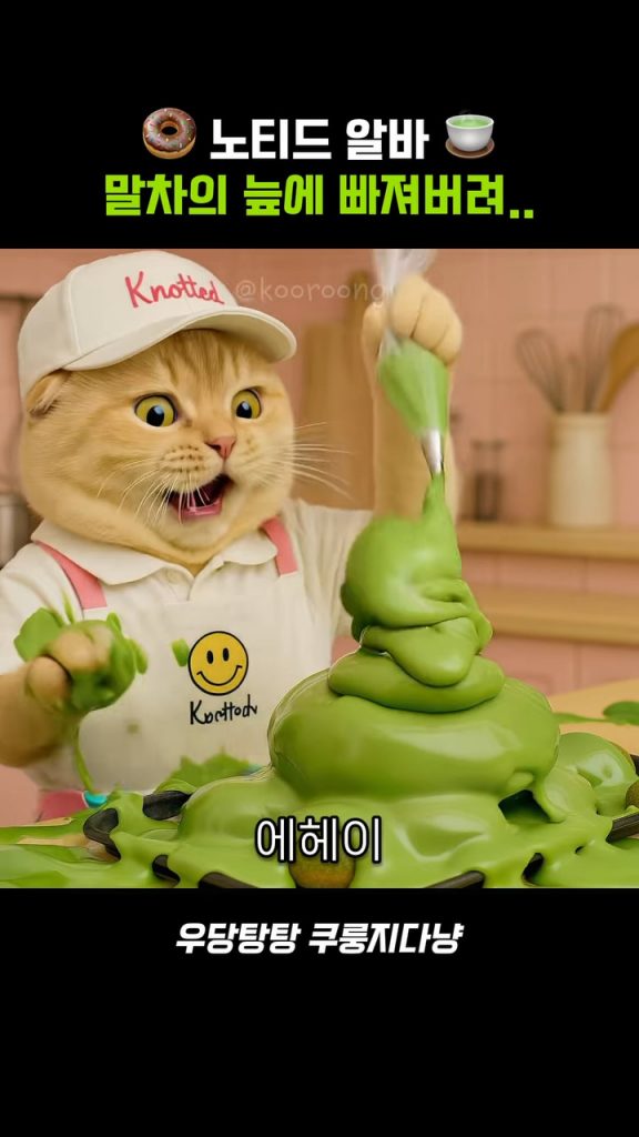 쿠룽지는 커뮤니티형 말투를 사용하며 친근함을 더했는데요. 동물들이 알바하는 건 쉽지 않나 봅니다. 쿠룽지도 역시 디저트를 만들며 우당탕탕 하는데요. 그 과정에서 쿠룽지는 말차 크림을 보여주는데 좀 더 집중했습니다. 크림이 진하게 녹아내리는 모습이나, 도넛을 입에 한가득 베어 물자 입가에 크림이 묻어나는 모습을 현실감 있게 그려냈습니다.