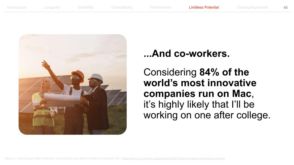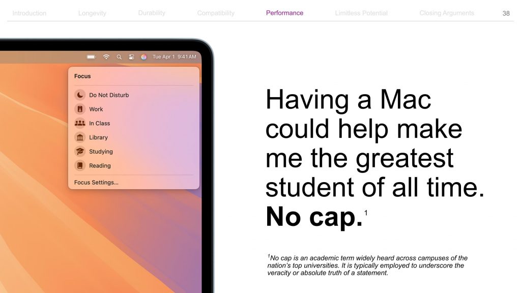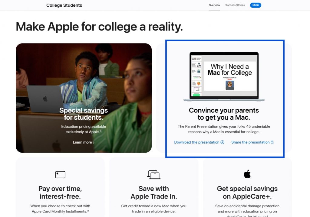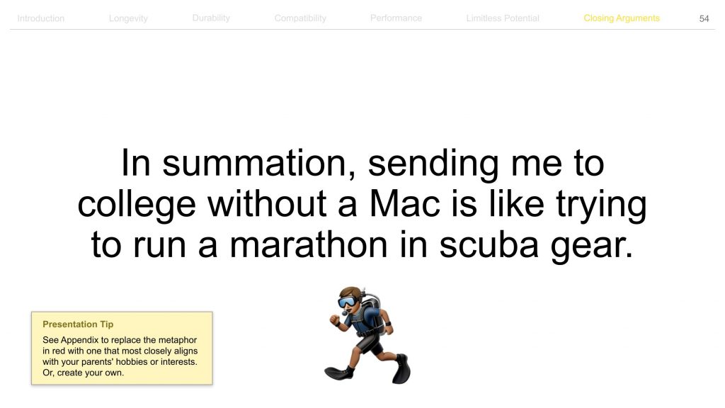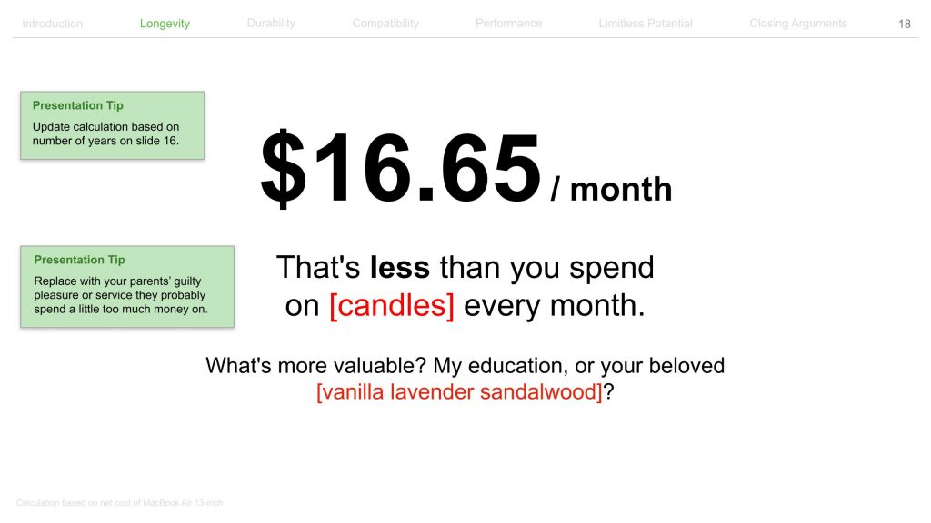 애플은 맥북을 간절히 원하는 대학생들을 훌륭한 세일즈맨으로 만들기로 결심합니다. 최근 애플 공식 웹사이트에는 대학생들이 부모님을 설득할 때 사용할 수 있는 약 80장 분량의 프레젠테이션 템플릿이 공개됐습니다. (템플릿은 이 링크에서 다운로드하실 수 있습니다.)