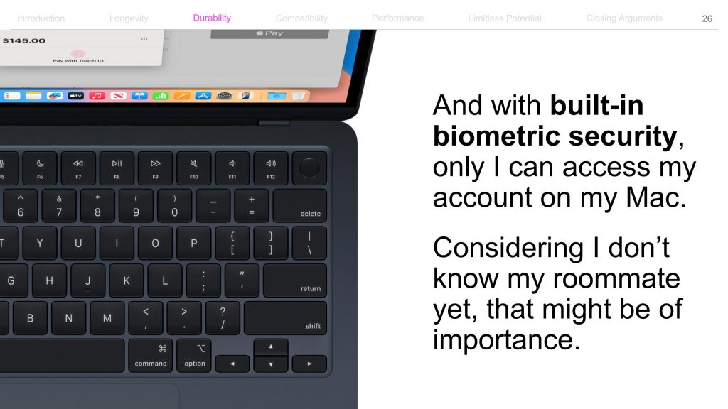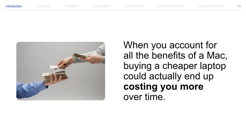 저렴한 다른 노트북을 선택할 경우 당장은 돈을 아끼는 것처럼 보일 수 있지만, 맥북의 폭넓은 활용성과 애플 생태계 이점 등을 고려하면 결국 돈을 아끼는 것과 같음을 언급합니다. 상대방이 미처 생각하지 못한 새로운 관점을 던져 맥북이 ‘서로가 윈윈 할 수 있는 선택’임을 강조합니다.