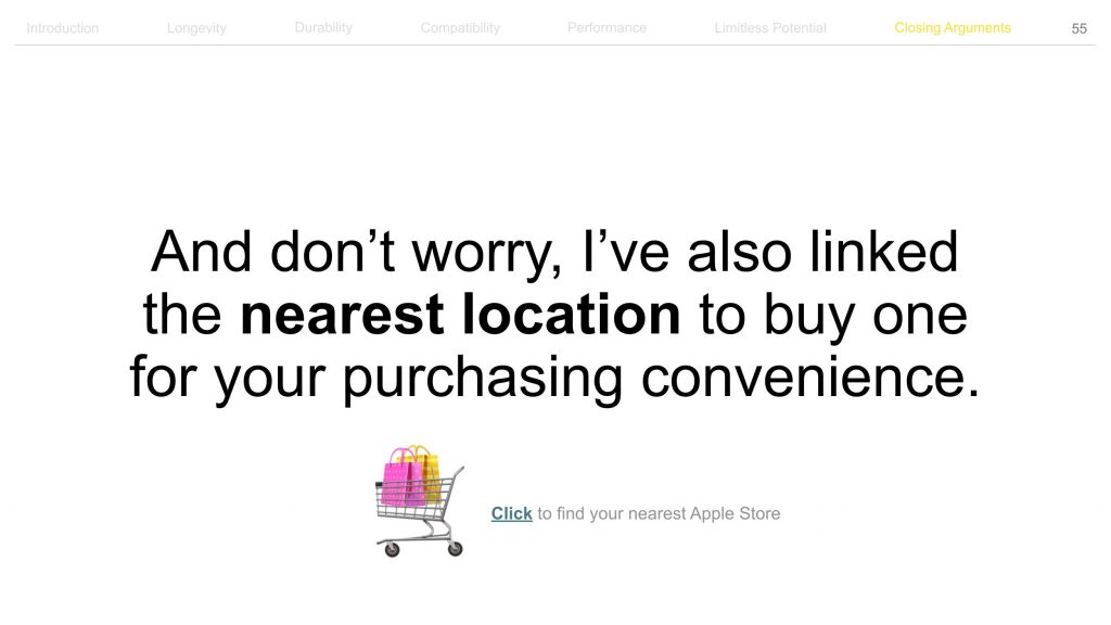 모든 설득의 목적지는 상대방의 특정 행동(구매, 구독, 계약 등)입니다. 가장 가까운 애플스토어 링크를 삽입해 상대가 다음 해야 할 행동(=맥북 구매)을 구체적으로 안내합니다. 랜딩 페이지에 CTA 버튼을 넣는 것과 같습니다.