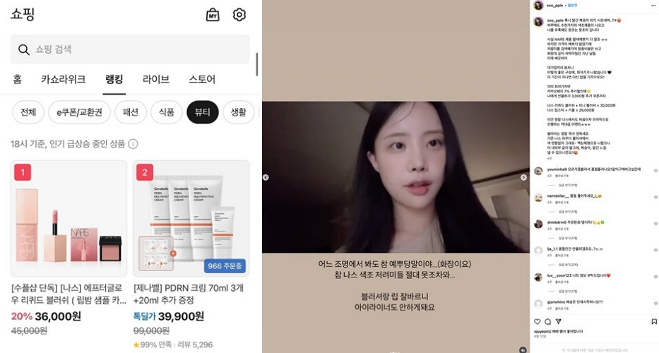 피처링이 나스와 진행한 인플루언서 단독 기획전에서는 실제로 카카오톡 뷰티 카테고리 랭킹에서 1위를 기록했는데요. 인플루언서와 함께 단독 구성을 제작하고, 인플루언서는 ‘뽀용’, ‘복숭아’와 같은 최근 화장 트렌드 키워드를 통해 지속해서 콘텐츠를 발행했습니다.