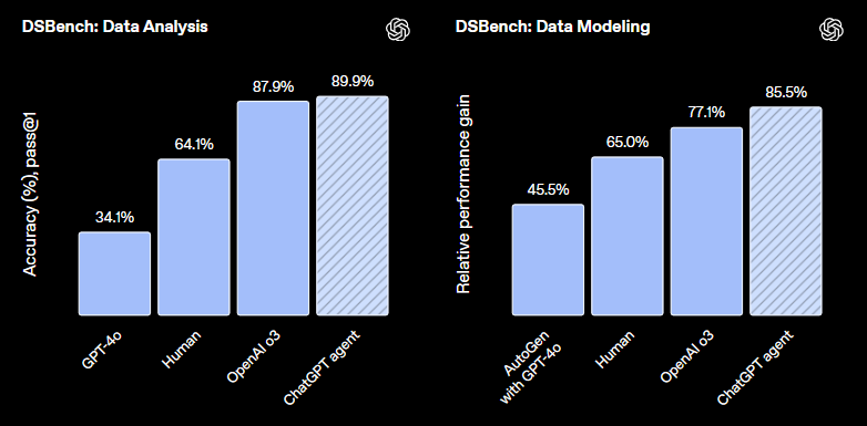 먼저, 실제 데이터 과학 작업을 에이전트가 얼마나 잘 수행하는지 평가하는 ‘DSBench’에서 ChatGPT 에이전트는 기존 자사 모델들을 압도했을 뿐 아니라, 사람보다도 높은 점수를 기록하며 주목을 받았습니다.