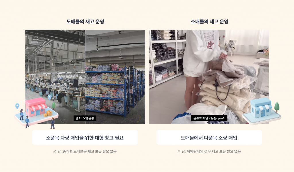 소매몰은 도매몰에서 다양한 품목의 상품을 소량으로 매입해 최종 소비자에게 판매하는데요. 이때 판매 방식에 따라 재고 관리 유무가 달라져요. 가장 흔한 위탁판매는 재고 없이 도매몰에서 고객에게 바로 배송하는 반면, 사입판매는 도매몰에서 상품을 미리 매입한 후 직접 재고를 보유하고 판매하죠.