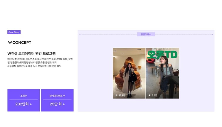 W컨셉은 자사 앱 내의 양질의 UGC를 확보하기 위한 숏폼 캠페인을 연간 진행하였습니다. 동시에 위에서 언급한 전략인 자동 DM 발송을 통한 매출 전환까지 고려하여 자동 DM 솔루션 연동을 통한 효과적인 세일즈 연계 캠페인을 운영하는 것에 대한 니즈가 있었습니다.