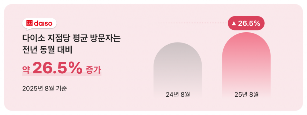 실제로 2025년 8월 기준 다이소 지점당 평균 방문자는 전년 동월 대비 약 26.5% 증가했는데요(출처: 로플랫 데이터). 이는 저렴한 가격에도 기본 품질을 보장하는 실속형 소비가 꾸준히 선택받고 있으며, Z세대가 말하는 ‘양품 소비’와 맞닿아 있음을 보여줍니다.