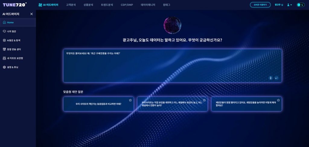 A. ‘튜니’는 기본적으로 우리 ‘Tune720’과 플랫폼에서 발생하는 데이터를 기반으로 최적화된 솔루션을 제공합니다. 지금 주신 질문에 명확한 답을 가지고 있습니다.
