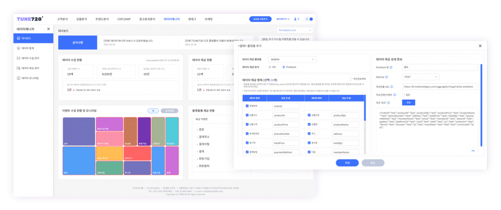수집된 데이터를 대시보드 형식으로 제공하고 원하는 플랫폼에 저장 가능한 ‘튜니’의 데이터매니저 기능