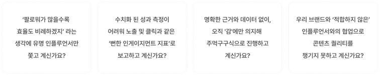 인플루언서 마케팅은 ‘팔로워가 많을수록 효율도 비례할 것’이라는 막연한 생각에 의존하기보다, 명확한 근거와 데이터를 통해 수치화된 성과 측정이 필요합니다.