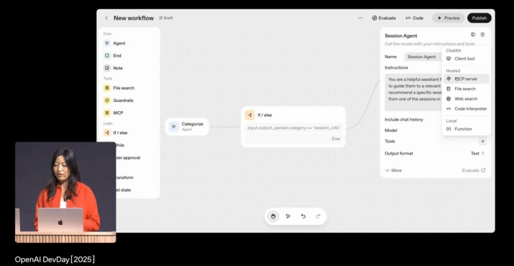 • 첫째, ‘에이전트 빌더(Agent Builder)’는 AI 에이전트의 작동 논리와 워크플로우를 시각적으로 설계할 수 있는 캔버스다.