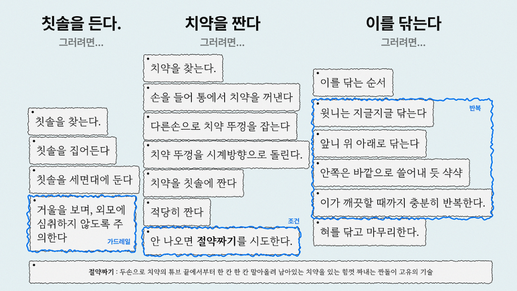 절차적 사고는 사실 ‘서비스 기획자’라면 반드시 지녀야 할 태도입니다. 생각을 분해하고, 순서를 만들고, 적절한 조건과 제약으로 원하는 결과물을 만들어 나가는 과정입니다. 아래의 사진을 보면 절차적 사고에 대해 더 잘 이해할 수 있습니다.