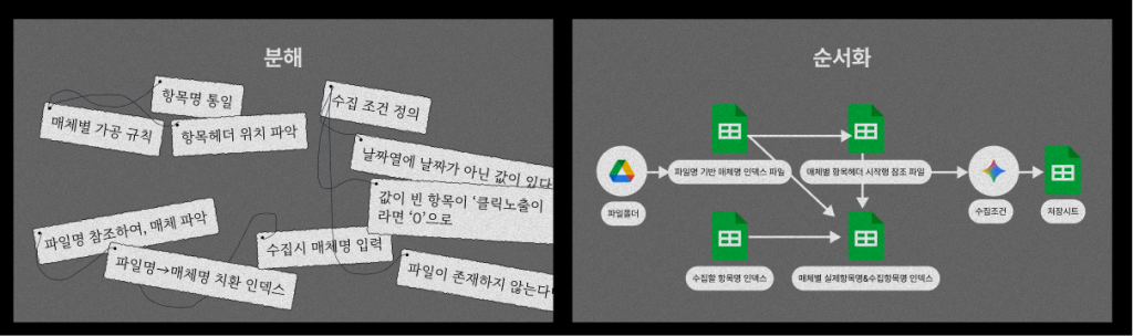 보기만 해도 골치 아프죠? 그런데 이렇게 문제를 적어 내려가는 것만 해도, 절차적으로 생각하는 과정이 잘 나타납니다. 문제를 분해해 놓고 보면, 어떻게 해결해야 할지 하나하나 답이 보입니다. 위 문제를 해결하기 위해 인덱싱 역할을 할 다양한 시트를 먼저 미리 생성해 두었습니다. 그리고 이것들을 조합하는 하나의 웹사이트 도구를 만들었습니다. 인증된 사용자라면 누구나 이 사이트에 접속하고, 구글 로그인을 통해 데이터를 가공할 수 있습니다.