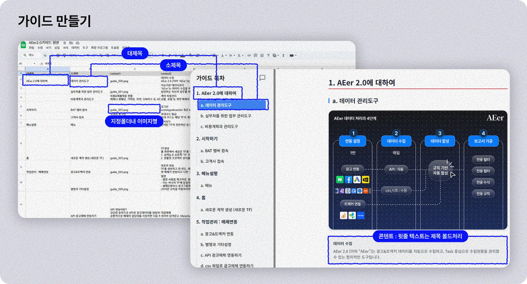 새롭게 론칭하는 서비스의 가이드 문서 제작을 위해 스프레드 시트에 내용을 입력하고, 이 내용이 웹사이트에 자동으로 퍼블리싱되는 도구를 만들고 싶었는데, 그러려면 이미지를 구글드라이브에 업로드하는 시간도 아까웠거든요. 이렇게 만들어진 플러그인과 구글 스프레드 시트, 그리고 이것과 연동된 웹사이트까지 ‘Google AI Studio’로 제작하며 웹 버전의 가이드 문서를 매우 빠르게 제작할 수 있었습니다.