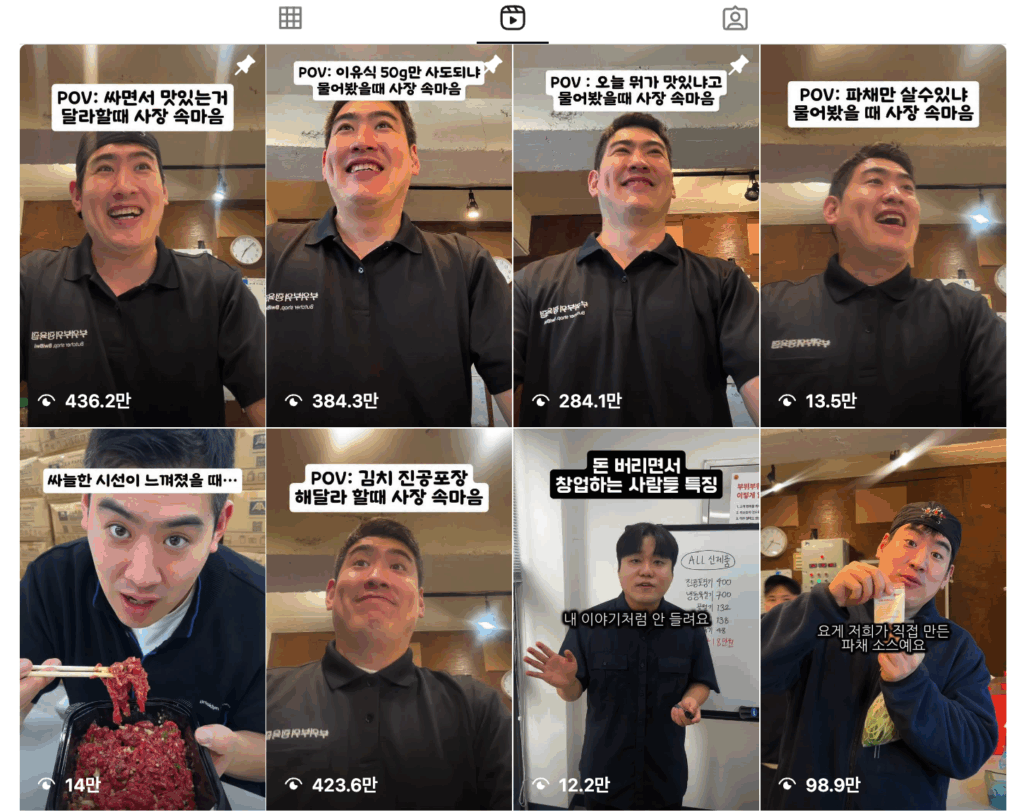 정육점 인스타그램에 고기 사진보다 사장님 얼굴이 더 많이 나온다면 어떨까요? 부위부위 정육점(@bwibwi_meat)은 고정관념을 부쉈습니다. ‘빙봉’ 캐릭터를 닮은 사장님이 직접 릴스에 등장해 유쾌한 일상과 고기 관련 정보를 보여주며 수백만 뷰를 연달아 찍었거든요! 이렇게 모은 팬들을 통해 마케팅하는 방법도 예사롭지 않습니다.