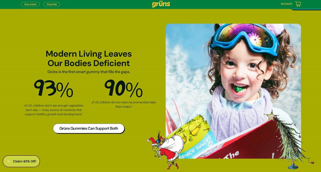 그륀스(Grüns)는 약 60가지 영양 성분(비타민, 미네랄, 프리바이오틱스 등)을 담은 곰 모양의 젤리를 판매합니다. ‘올인원’이라는 측면에서 이전에 다뤘던 AG1과 비슷하지만 ‘젤리’ 형태라 섭취가 더 쉽고 간편한 것이 특징입니다.