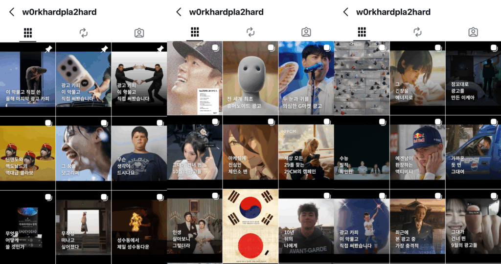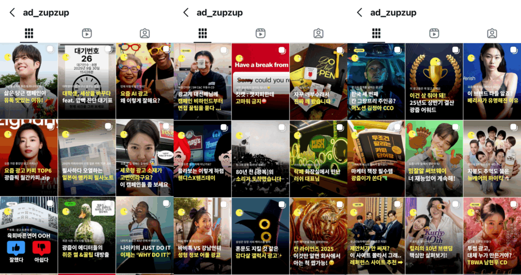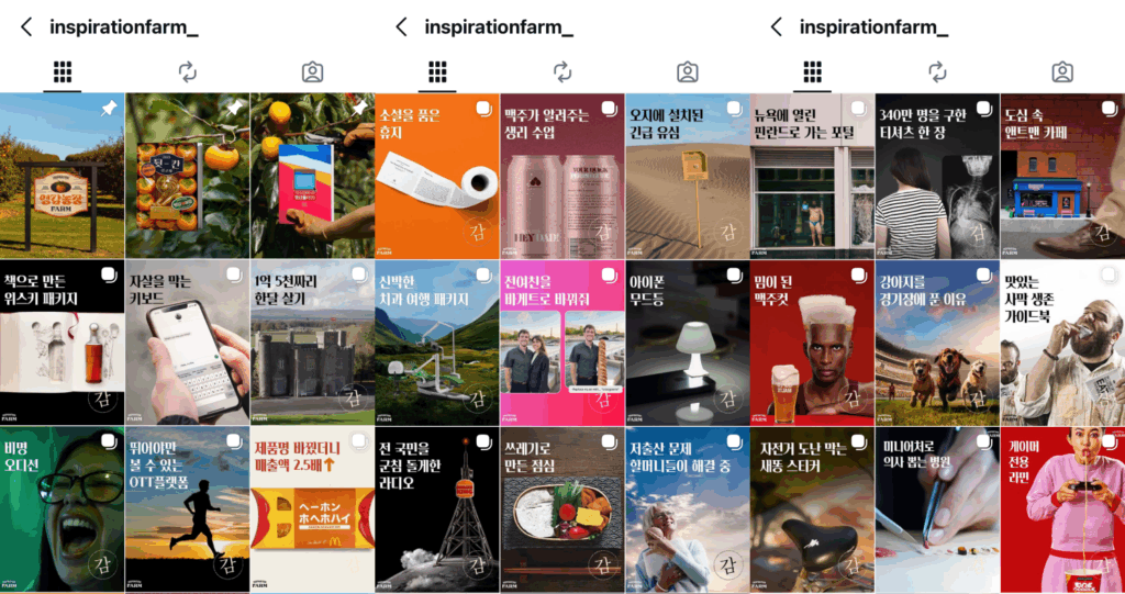 섬네일을 통일시켜 피드 전체의 비주얼 감도가 매우 높습니다. 이곳은 일상에서 직접 수집한 레퍼런스에 계정주의 짧은 감상과 솔직한 의견을 더해놓는 것이 특징입니다. 딱딱한 정보 제공이 아니라, 친구와 이야기를 나누는 듯한 코멘트를 읽으며 편안하게 인사이트를 얻을 수 있습니다. ‘귀엽거나 사소하거나 작은 일상 속 영감 한 꼭지들’, ‘타깃의 어떤 순간을 포착하느냐가 곧 메시지의 힘’과 같은 주제로 인쇄 광고 등을 깊이 있게 바라보며 코멘트를 남기는데, 주제 선정부터 깊은 고민과 통찰을 담아내려 노력하는 것이 느껴집니다. 구독자들의 영감 제보에도 적극적으로 코멘트를 달고, 업무 꿀팁도 나누는 등, 현재 업무가 막혀 있을 때 응용해 볼 수 있는 노하우나 레퍼런스가 가득한 커뮤니티형 보물 같은 공간입니다.