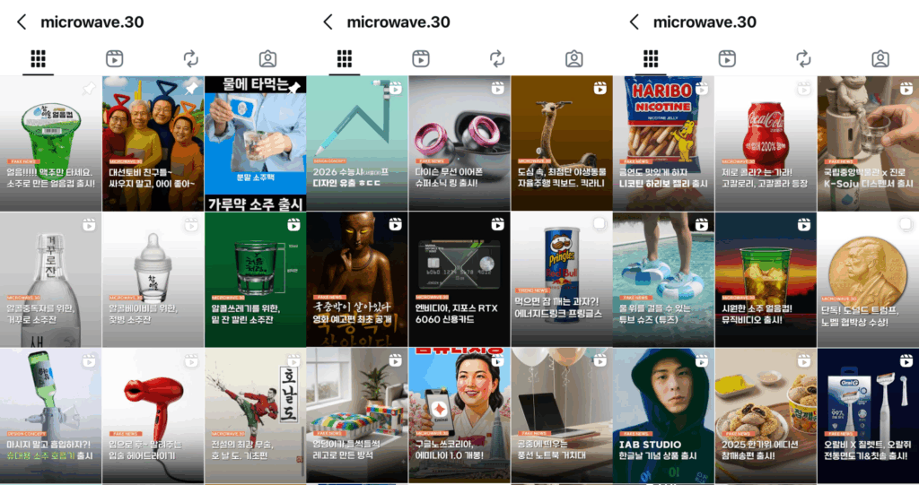 맥주를 부으면 바로 소맥이 완성되는 ‘소주로 만든 얼음컵’ 아이디어나, 물에 타 먹는 ‘가루 소주’ 출시, 먹으면 잠 깨는 과자 ‘프링글스 레드불’처럼 이마를 탁 치게 하는 기발한 아이디어를 제시합니다. 저는 처음 이 계정을 봤을 때 실제로 출시가 된다는 줄 알고 깜빡 속을 정도였는데요. 이처럼 높은 현실감을 주는 것은 계정이 인스타그램 매거진 포맷을 차용하고 있기 때문입니다. 덕분에 콘텐츠의 완성도와 현실 싱크로율이 매우 높은 편이죠. 주로 기존 제품을 비틀거나 두 가지 아이템을 섞어 새로운 기획을 만드는 발상을 보여주며, 기발한 크리에이티브가 필요할 때 잠시 머물러 발상의 전환에 빠져보시는 것을 추천합니다.