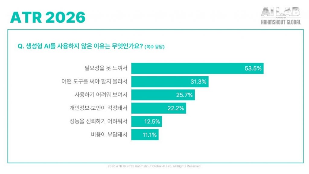 AI를 사용하지 않는 이유로는 ‘필요성을 못 느껴서’가 53.5%로 절반 이상을 차지했다. 기술의 난이도나 접근성보다 개인의 필요와 맥락에 AI가 들어오지 못한 점이 주요 요인으로 나타났다. ‘어떤 도구를 써야 할지 몰라서’라는 응답도 31.3%에 달해, 정보 부족이 진입 장벽으로 작용하고 있음을 보여줬다.