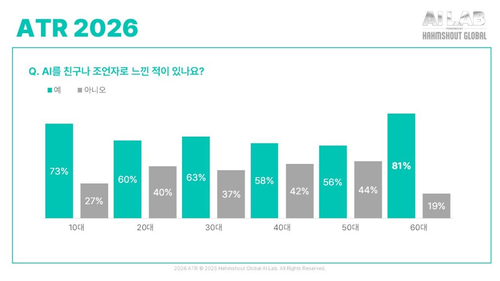 이는 60대가 AI를 ‘기능’보다는 ‘정서적 교감’의 대상으로 받아들이고 있음을 시사한다. 함샤우트 글로벌은 “60대의 낮은 사용률은 두려움의 문제가 아니라 정보와 동기 부족에서 비롯된 현상”이라며 “진입 장벽을 낮추고 ‘시작점’을 제공한다면, 향후 가장 잠재력 높은 사용자층이 될 수 있다”고 전망했다.