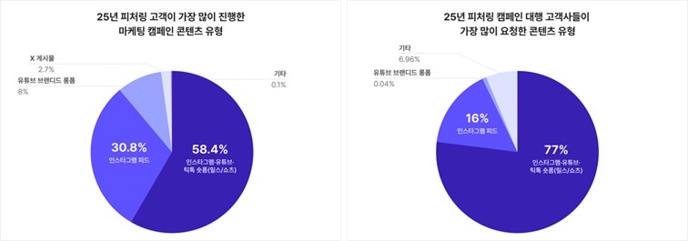 실제로, 2025년 1월~11월 피처링의 캠페인 대행 서비스를 이용한 고객사 중 77%가 인스타그램(릴스), 유튜브(쇼츠), 틱톡 등 숏폼 형태 콘텐츠를 요청했습니다.