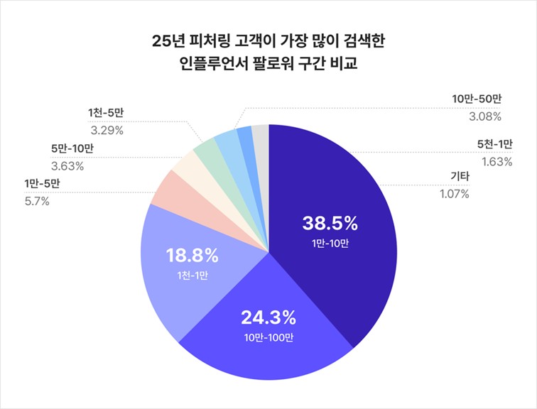 실제로 피처링 솔루션 고객이 가장 많이 검색한 인플루언서 팔로워 구간 역시 1만에서 10만(38.5%)이 가장 높았으며, 그 뒤로는 10만에서 100만(24.3%), 1천에서 1만(18.8%) 순으로 나타났습니다.