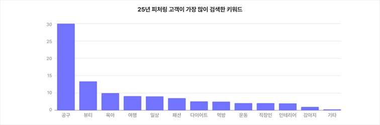 올해 피처링 솔루션 내에서 가장 많이 검색된 키워드는 ‘공구(30%)’였으며, 이는 브랜드들이 인플루언서를 활용한 직접 판매를 매출 증대의 핵심 수단으로 활용하고 있다는 점을 보여줍니다.