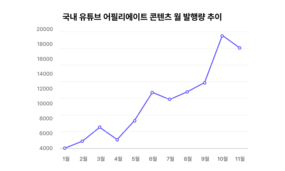 연초 약 4천 건에서 시작된 어필리에이트 콘텐츠는 10월 기준 약 19,000건 이상까지 발행되며 가파른 성장세를 보였습니다.