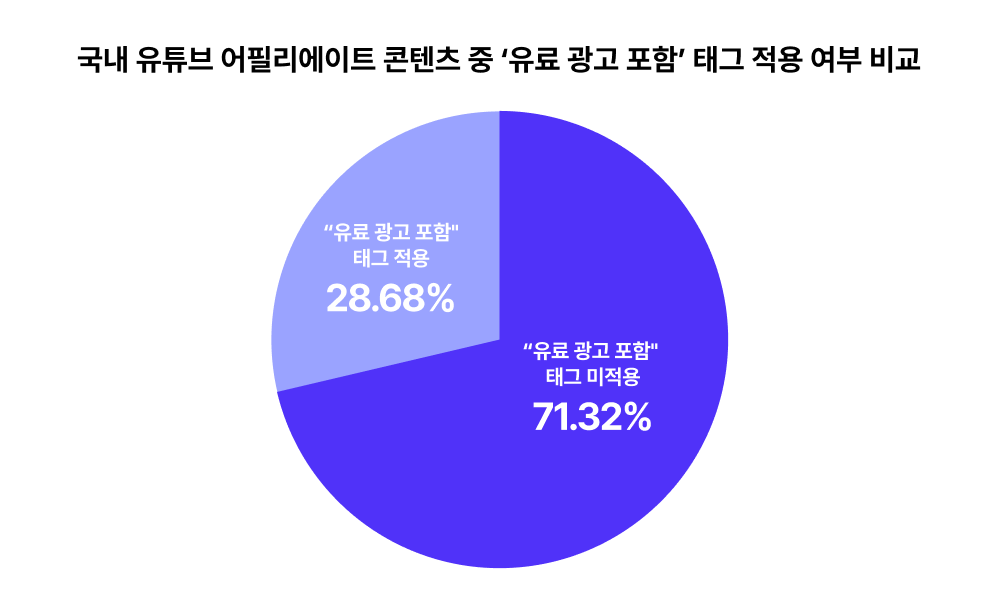 이번 분석에서 특히 주목할 만한 점은, 전반적인 어필리에이트 콘텐츠 중 ‘유료 광고 포함’ 태그가 적용된 콘텐츠가 28.68%에 불과하다는 점입니다. 즉, 7할 이상의 콘텐츠가 광고 표기 없이 발행되고 있는 상황입니다.