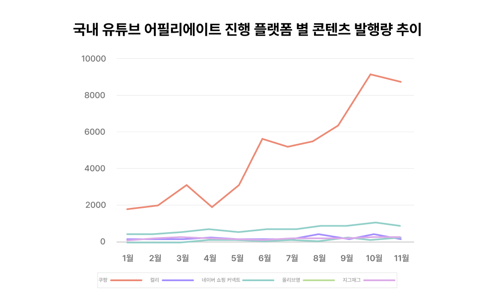 플랫폼별 어필리에이트 콘텐츠 발행량을 살펴보면, 쿠팡이 단연 압도적 1위를 차지하며 어필리에이트 마케팅의 중심 플랫폼으로 자리 잡고 있습니다.