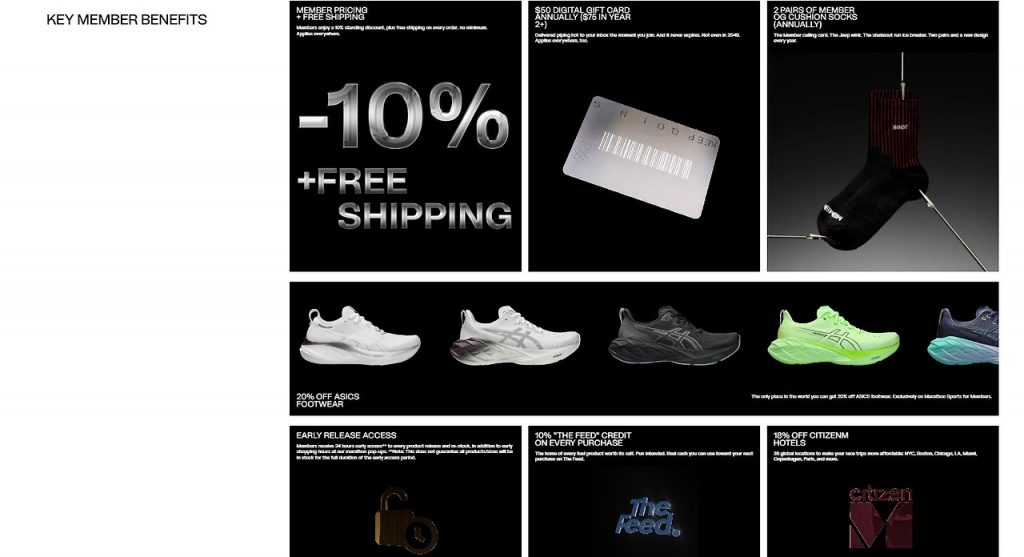 이외에도 사우나 할인, 회복을 위한 요가 및 수면 용품 할인 등 멤버십은 철저히 ‘러너’들에게 꼭 필요한 혜택으로 구성되어 있습니다. 그중에서도 신제품을 일반 고객보다 먼저 구매할 수 있는 혜택은 소량 제작 및 출시 방식과 시너지를 내면서 멤버십 가입에 대한 욕구를 더 자극시킵니다.