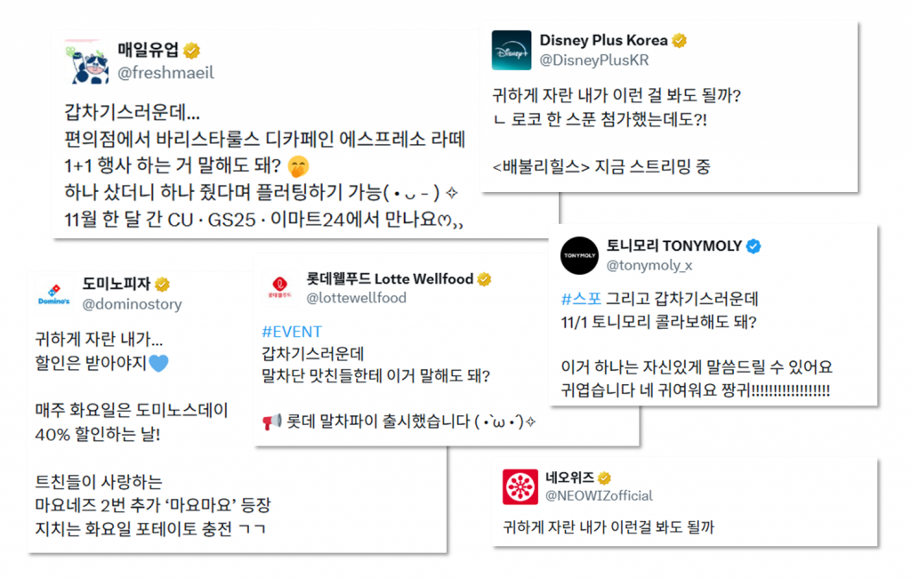 특히, 최근 유행했던 ‘귀하게 자란 내가 이런 걸 봐도 될까?’, ‘갑차기스러운데’처럼 커뮤니티에서 시작된 표현이 순식간에 SNS 전반으로 퍼지고, 다양한 브랜드의 공식 계정과 콘텐츠에 활용되며 하나의 유행어처럼 자리 잡는 모습도 볼 수 있었는데요.
