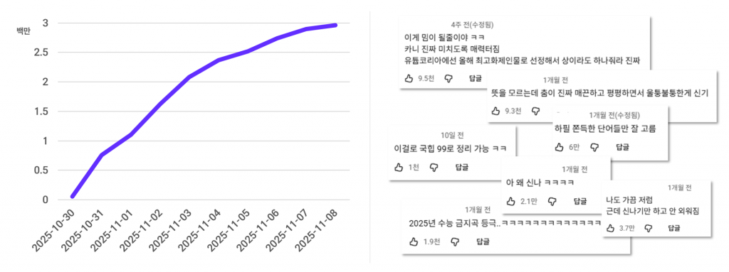 영상을 시청한 사람들 또한 ‘수능 금지곡 같다’, ‘느낌 좋다’, ‘계속 흥얼거리게 된다’와 같이 긍정적인 반응을 다수 남기며 콘텐츠가 짧은 시간 안에 하나의 유행으로 자리 잡게 되었습니다.