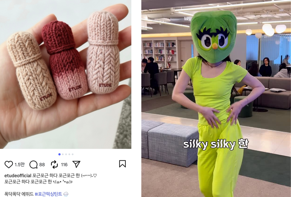 이러한 흐름은 자연스럽게 브랜드로도 이어졌는데요. 에뛰드는 공식 인스타그램 게시글에 ‘매끈매끈하다’는 표현을 활용해 트렌드에 빠르게 반응했고, 듀오링고 역시 릴스를 통해 해당 멜로디와 리듬을 차용한 영상을 선보이며 유쾌한 브랜드 콘텐츠를 제작했어요.