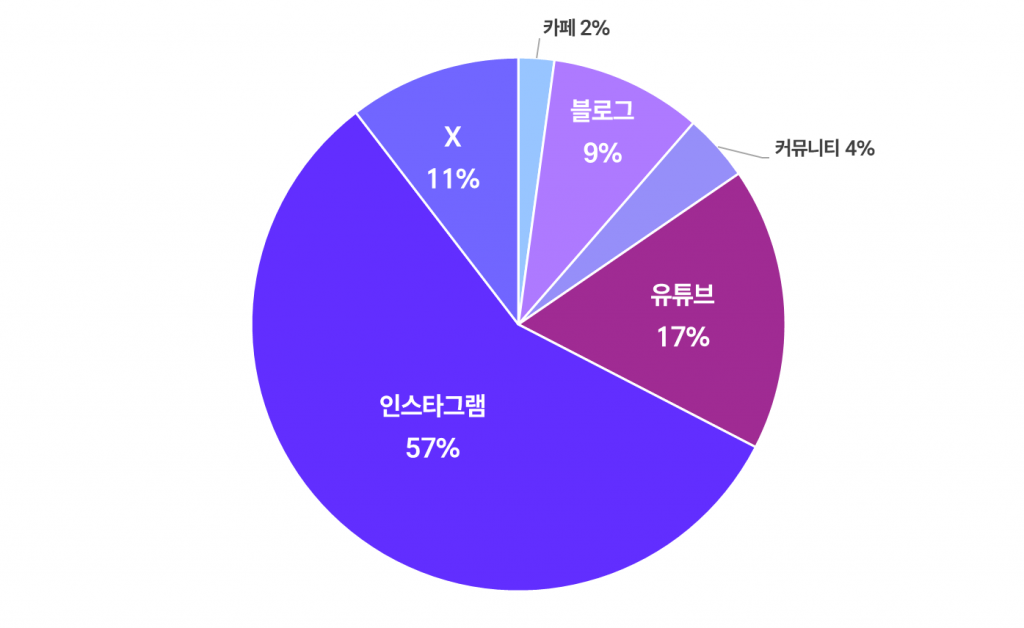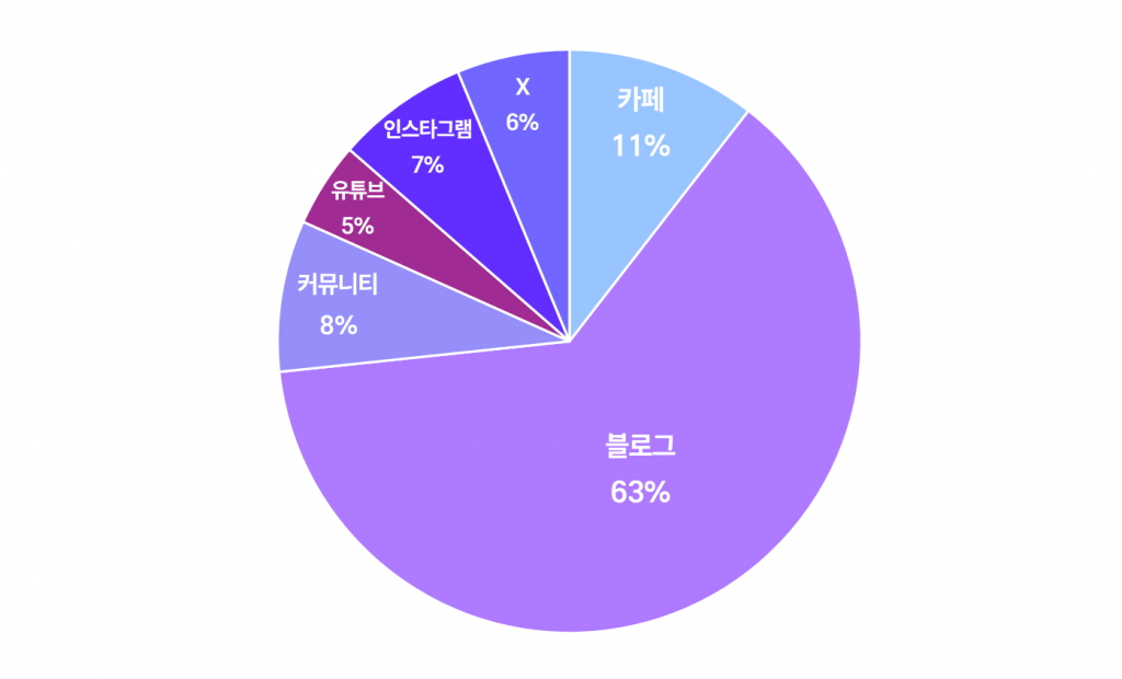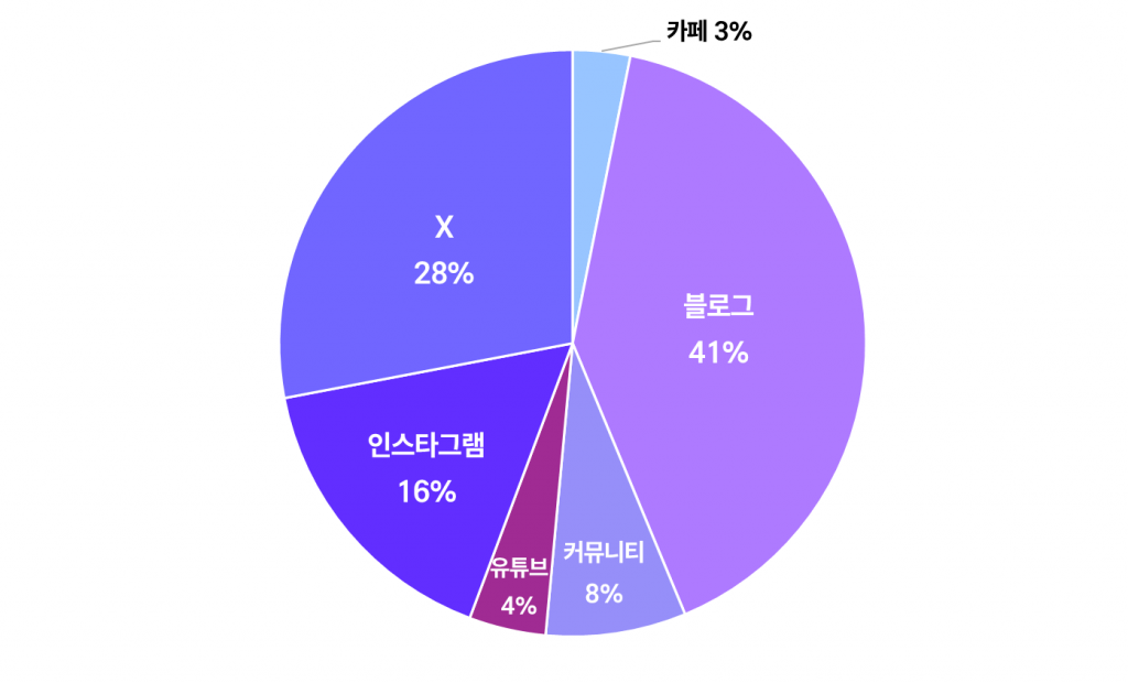 유튜브와 X(구 트위터)도 비교적 높은 버즈량을 기록한 반면, 텍스트 중심의 커뮤니티나 카페에서는 상대적으로 언급이 적은 흐름이 나타난 것을 파악할 수 있었어요.