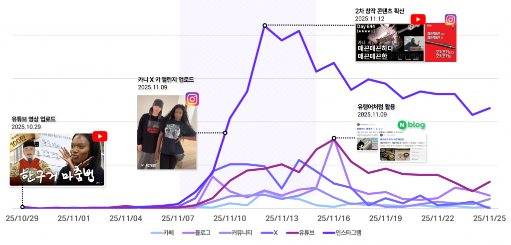 X(구 트위터)의 경우에는 유행 후반부에 다시 한번 언급량이 상승하는 흐름이 관찰되며, 유행이 정점을 지난 이후에도 관련 표현이 재소비되는 모습을 보여주기도 했습니다.