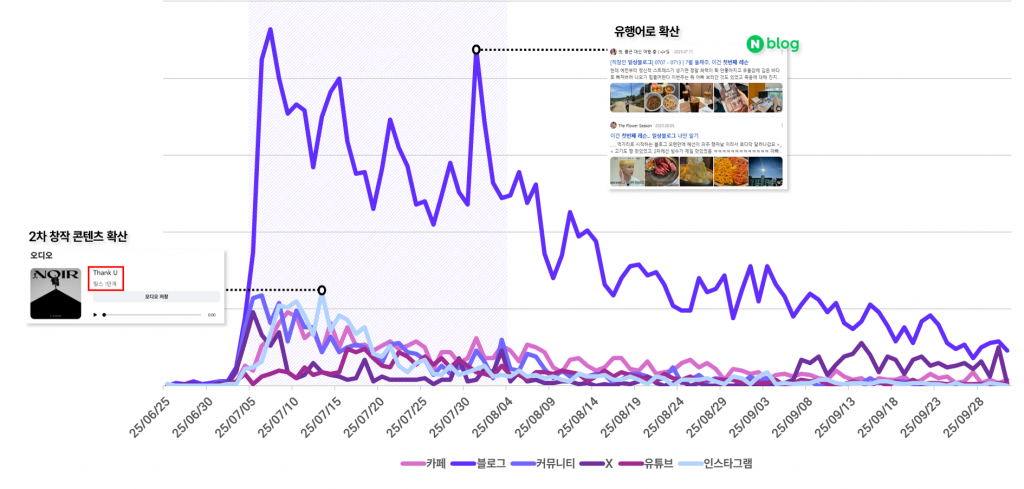 반면, 유튜브와 인스타그램, X(구 트위터)의 경우 숏폼 영상과 클립 공유를 중심으로 일정 수준의 버즈가 형성되었지만, 전체 언급량에서는 블로그 대비 상대적으로 낮은 비중을 차지하는 모습을 볼 수 있었어요.