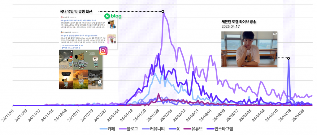 이처럼 ‘칠 가이’는 다른 밈과 달리 유행 정점 이후에도 언급량이 급격히 감소하지 않고, 일정 수준으로 유지되는 특징을 보였는데요. 약 3개월의 기간 동안 유행이 지속된 것을 보면, 다양한 채널과 맥락에서 반복적으로 활용되는 소비가 지속적으로 이어진 영향으로 보여요.