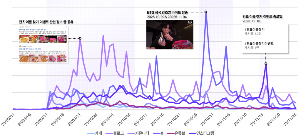 X(구 트위터)의 경우, BTS 정국이 라이브 방송을 통해 ‘칸쵸깡’에 참여한 시점을 전후로 언급량이 급격히 증가하는 흐름이 확인되며 해당 시점이 전체 버즈 확산에 큰 영향을 미친 것을 확인할 수 있었고요.