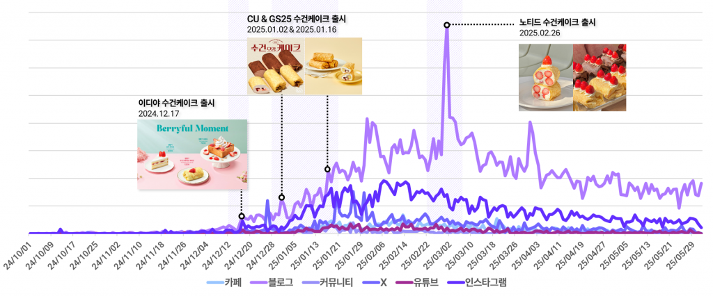 일별 버즈량 추이를 살펴보면, 수건 케이크 관련 언급은 12월 초부터 점차 증가하기 시작했는데요. 유행 초기 ‘이디야’에서 발 빠르게 관련 제품을 출시하며 관련 언급이 일부 발생한 점을 확인할 수 있었어요. 이후 CU, GS25와 같은 편의점 및 베이커리 브랜드에서 수건 케이크 제품이 잇따라 출시되며 버즈량이 급격하게 늘어나는 모습을 보이기도 했고요.