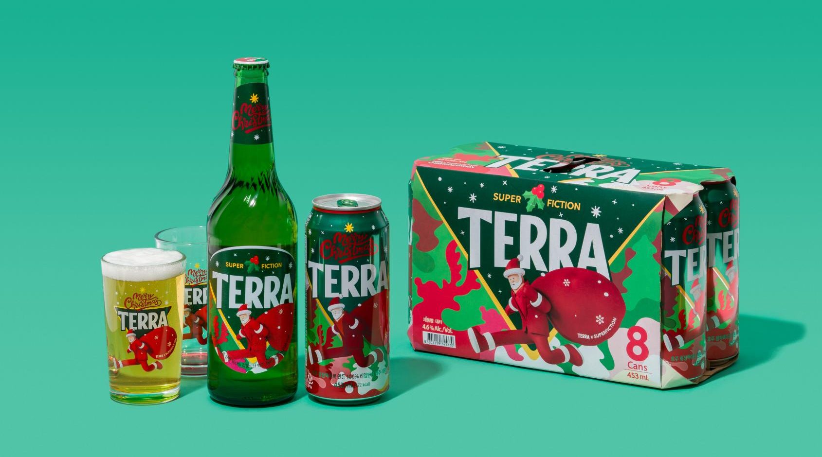하이트진로는 크리스마스 시즌을 맞아 한정판 패키지의 테라 크리스마스 에디션을 선보였다. 청정한 브랜드 컬러 위에 눈 내리는 크리스마스 풍경과 산타 캐릭터를 더해 따뜻한 연말 감성을 강조했고, 테라의 상징인 ‘리얼탄산’은 눈송이 형태로 시각화했다.