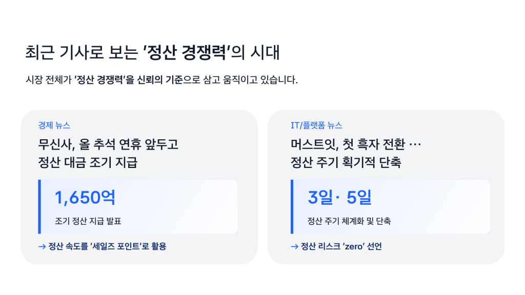 이들에게 정산은 단순히 돈을 주는 행위가 아닙니다. 파트너에게 “우리 플랫폼은 현금흐름이 건강하다”라는 강력한 메시지를 전달하는 세일즈 무기인 셈입니다.