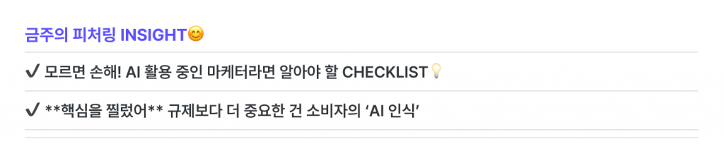 대부분의 마케터는 ‘AI 이용자’에 해당하기 때문에, 엄격한 규제가 따르는 대상은 아닙니다. 하지만 마케터가 콘텐츠를 소비자에게 전달하는 실행의 주체라는 점에서, 소비자 신뢰를 고려한 자체 기준은 필요하죠.