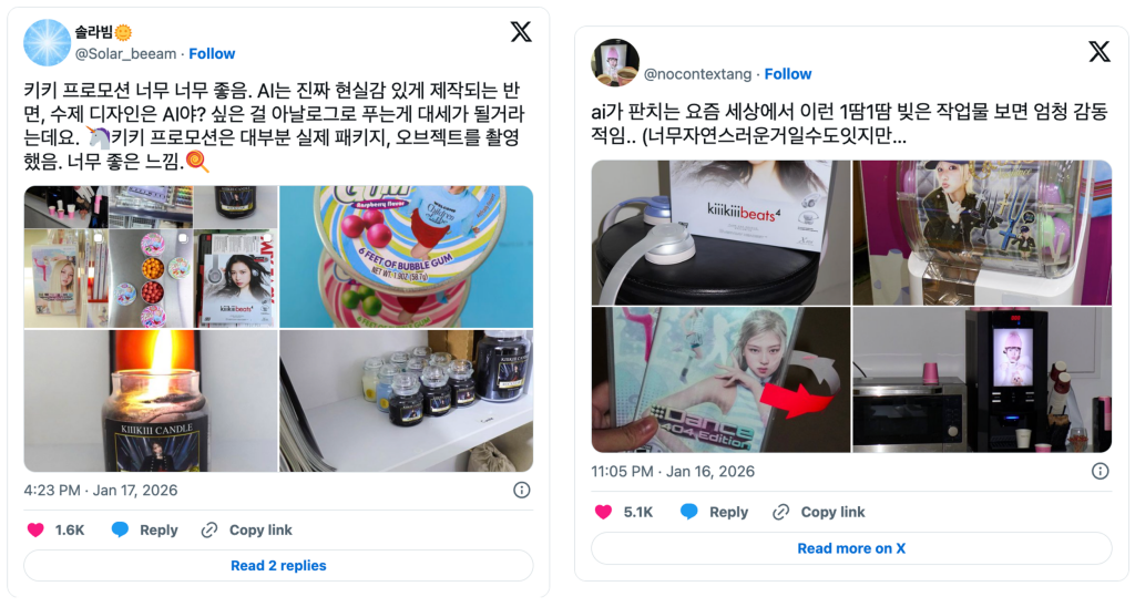 AI 기반 디자인에 대한 부정적인 시선이 늘어난 요즘, 키키가 AI가 아닌 실제로 구현한 아트 이미지를 활용했다는 점도 긍정적으로 언급되곤 하죠.