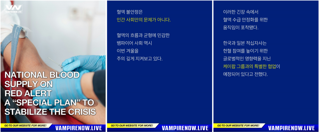 엔하이픈의 ‘VAMPIRE NOW’ 홈페이지에도 ‘전국 혈액 보유량이 부족해 인간과 뱀파이어 사회 모두 촉각’이라는 기사 형식의 콘텐츠가 업로드되며, 캠페인을 세계관 안의 이야기처럼 자연스럽게 녹여냈고요.