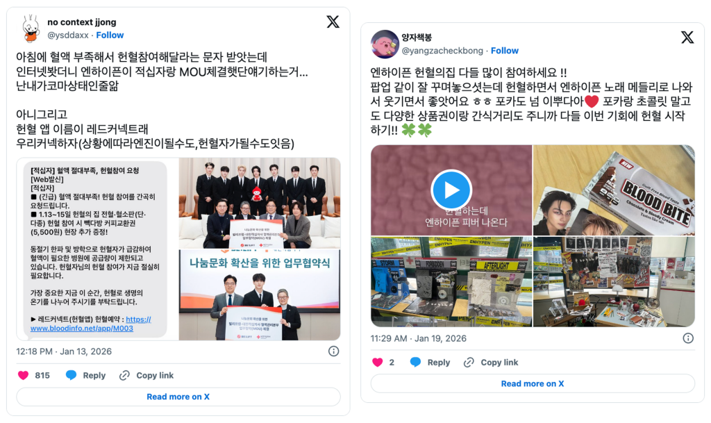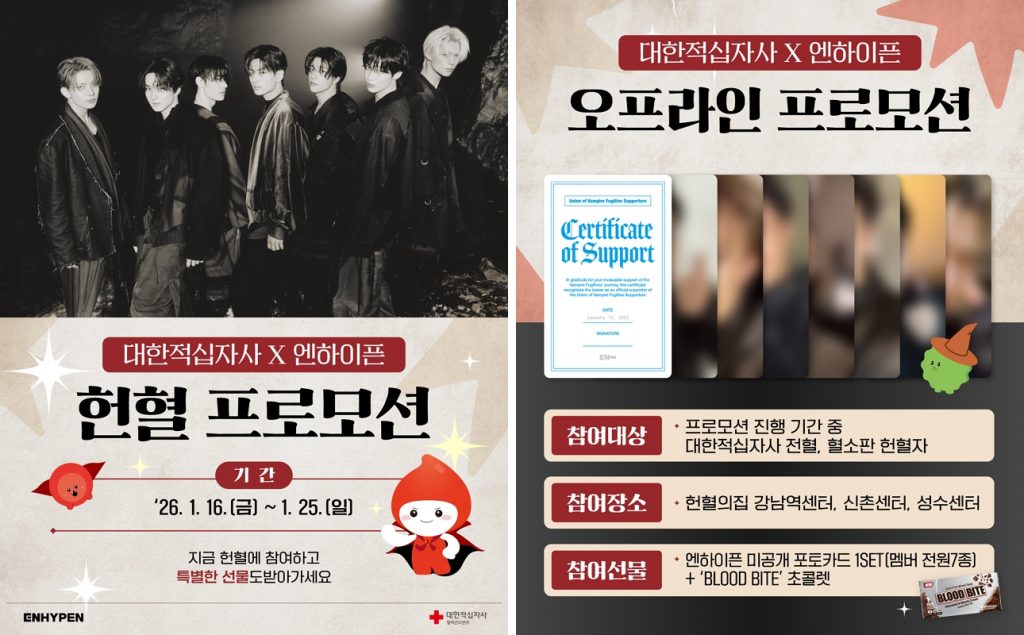 ✔️ 엔하이픈과 대한적십자사와 함께한 헌혈 캠페인이 긍정적인 반응을 얻고 있어요. 뱀파이어와 인간이 공존한다는 콘셉트를 유지한 채 굿즈를 제공하며, 공익 협업과 팬덤 파워를 긍정적으로 활용한 사례였습니다.