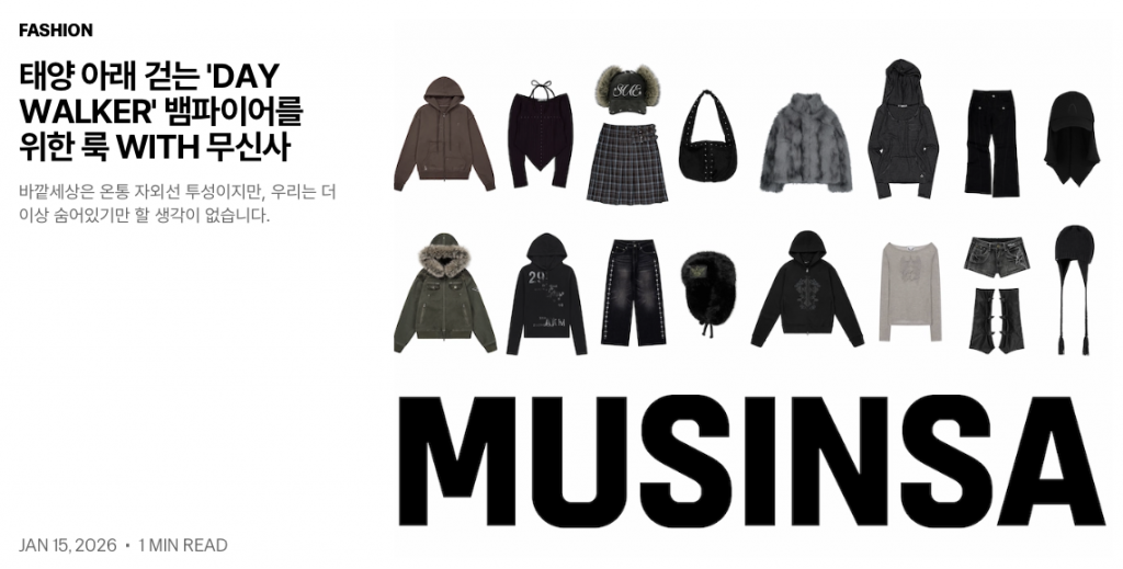 엔하이픈은 이번 컴백에서 ‘태양 아래를 걷는 뱀파이어’를 위한 데이워커 룩을 소개하는 콘텐츠를 홈페이지에 공개했는데요. 알고 보니 무신사와의 콜라보로 진행된 프로모션이었습니다. 블랙 컬러를 중심으로 한 스트릿 패션을 큐레이션하며, 뱀파이어 세계관을 패션 영역으로 확장한 시도였죠.