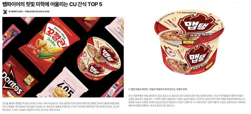 콘텐츠에서는 마늘 알레르기가 있는 뱀파이어가 임상에 성공했다는 유쾌한 스토리와 함께, 삼양식품의 맵탱 마늘조개라면을 소개하고 뱀파이어의 날카로운 손톱을 연상시키는 뾰족한 꼬깔콘 등 레드 컬러 중심의 간식을 소개했죠.