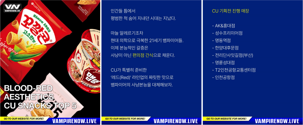 마늘 알레르기마저 현대 의학으로 극복한 21세기 뱀파이어라는 스토리 아래, 엔하이픈은 CU와 함께 이색 콜라보를 진행했는데요. 뱀파이어 세계관을 편의점 F&B 카테고리까지 확장한 프로모션입니다.